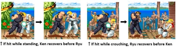 For example, if a crouching Honda gets hit by cross-up jump medium kick into crouch medium kick from Ryu, Honda will stand upon getting hit by the crouch medium kick. Ryu can then cancel into his Tatsumaki, which normally misses on crouching opponents, but will hit the standing Honda here.