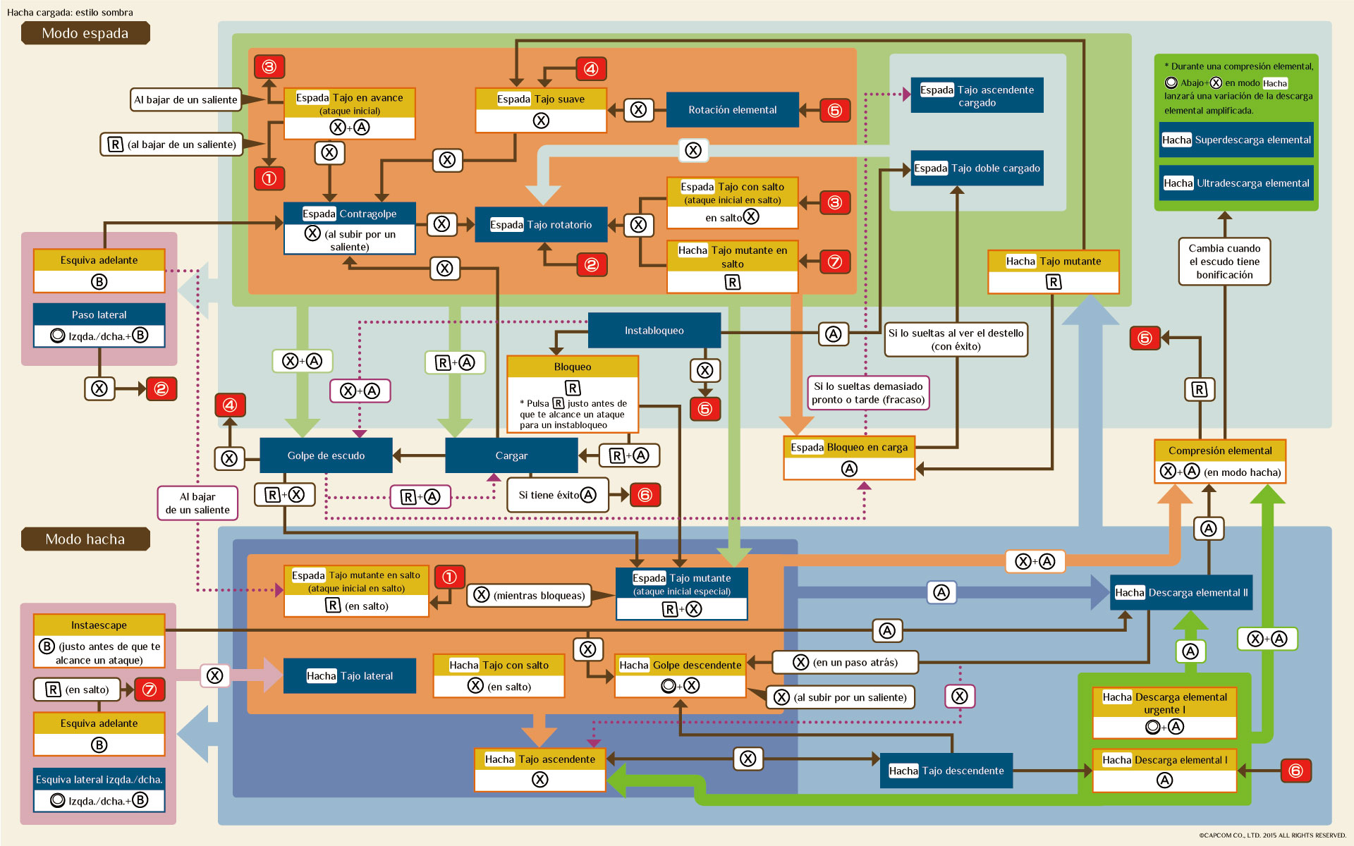 Tras un instabloqueo, pulsa Aボタン para realizar un tajo doble cargado y cargar rápidamente los revestimientos, o pulsa Xボタン para hacer una rotación elemental.