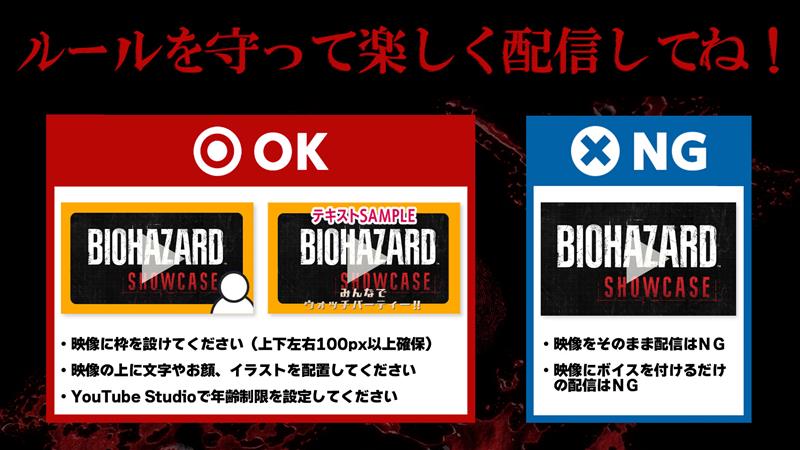 5. 「ウォッチパーティー」ご参加時には、「バイオハザード ショーケース」の映像をそのまま使用せず、必ず映像に枠(上下左右100px以上確保)を付けてください。また、映像の上に文字やお顔、イラストを配置してください。映像をそのまま配信したり、映像にボイスを付けるだけの配信は禁止いたします。(下図参照)